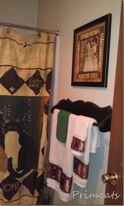 Your bathroom looks so nice. At our previous house I had the guest bath decorated in a cat theme. Love the towel rack that Rachel refinished, looks great. I like how you put the tree in the crock, very prim.